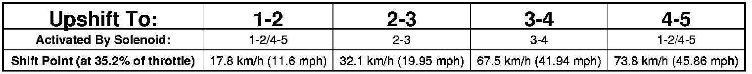 1. Accelerating upshift, which is an upshift under a load. For shift time adaptation for the 1-2 upshift to take place, the transmission must shift from 1st to 2nd in six different engine load ranges vs. transmission output speed ranges.