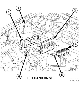 1. The PCM (Powertrain Control Module) (3-Left Hand Drive), or (3-Right Hand Drive) is located in the engine compartment.