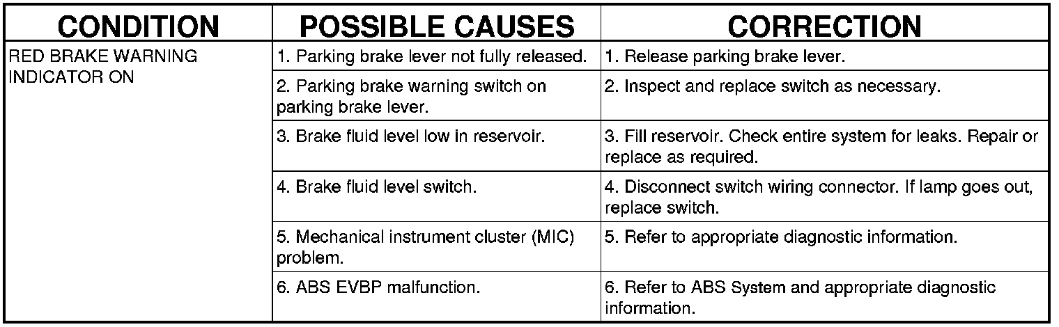 NOTE: There are three diagnosis charts following that cover the RED BRAKE WARNING INDICATOR, BRAKE NOISE and OTHER BRAKE CONDITIONS.