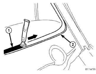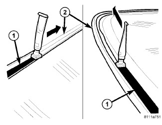 8. Apply primer (1) around the perimeter of the glass to a width of 15 mm (0.5 in.) (2).