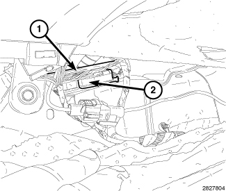 3. While holding back the trim panel and the carpet, locate and release the 2 holding tabs on the TCM bracket to release the TCM (1).