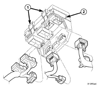 5. Using an appropriate flat bladed tool, depress the four mounting clips to disengage and remove the TIPM housing (1) from the TIPM bracket mounting tabs (3).