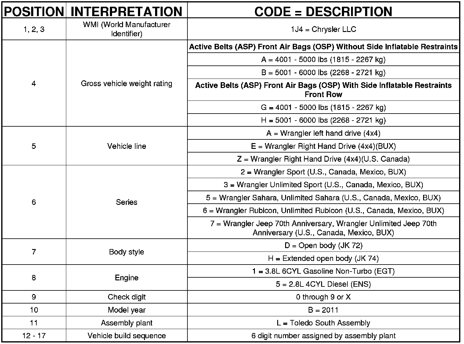 VEHICLE IDENTIFICATION NUMBER DECODING CHART