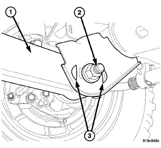Caster can be adjusted by installing a Mopar(R) cam adjustment kit located between the notches in the axle bracket (3) and moving the lower suspension arm (1) at the axle forward or rearward.