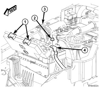 4. Position the TIPM positive cable (4) onto the mounting stud and install the retaining nut (2). Tighten the nut to 9 - 11 Nm (80 - 100 in. lbs.).