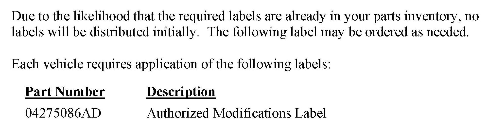 Due to the likelihood that the required labels are already in your parts inventory, no labels will be distributed initially. The following label may be ordered as needed.