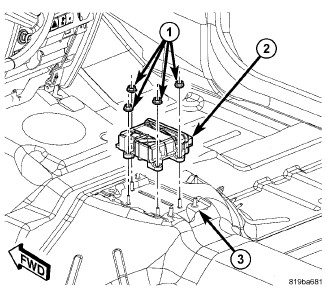 1. Carefully position the Occupant Restraint Controller (ORC) (2) onto the four studs of the ORC mount (3) on the floor panel transmission tunnel. When the ORC is correctly positioned, the bottom of the housing will fit flush with the mount and the orientation arrow on the label on top of the housing will be pointed forward in the vehicle.
