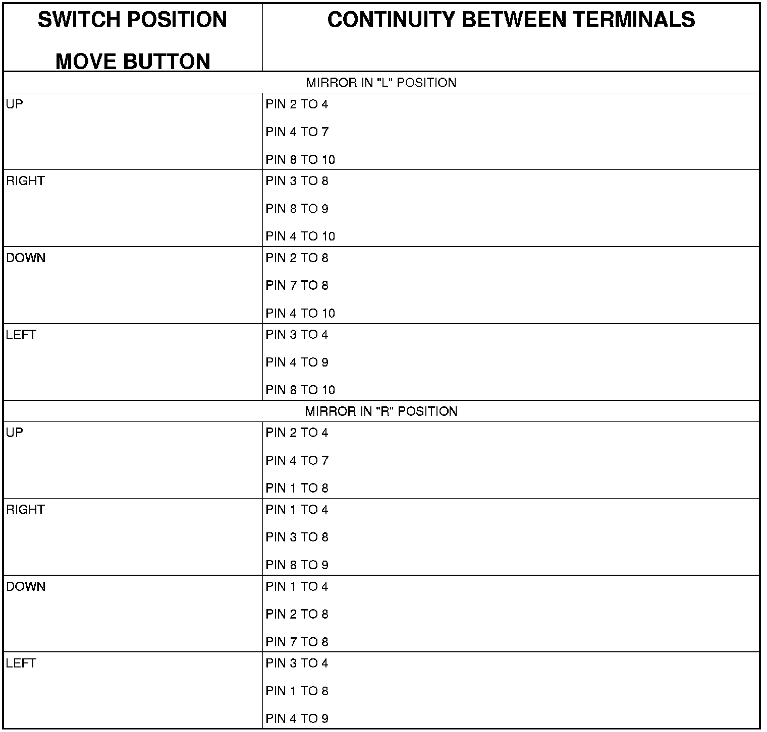 3. Using an ohmmeter, test for continuity between the terminals of the switch as shown in the Mirror Switch Test table.