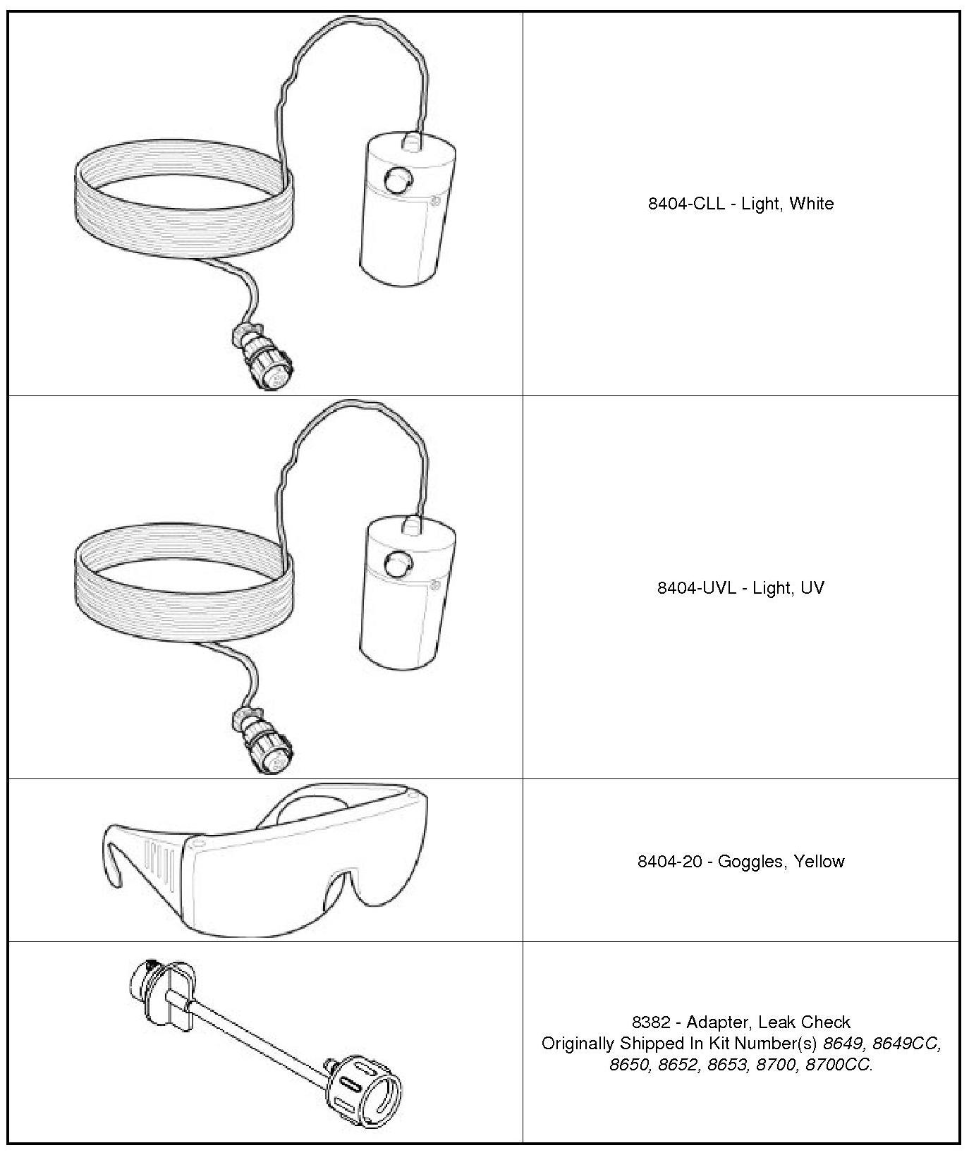 7. If a leak is concealed from view (at the top of the fuel tank, for example), release the remote smoke/air start button, and use the ultraviolet (UV) black light and the UV goggles to look for residual traces of dye that is left behind by the smoke.