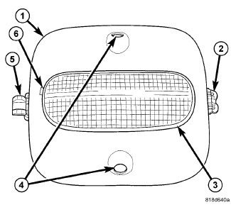 An Intrusion Transceiver Module (ITM) is part of the export premium version of the Vehicle Theft Alarm (VTA) in the Vehicle Theft Security System (VTSS). The export premium version of the VTA is only available in vehicles built for certain markets, where the additional features offered by this system are required. The ITM is integral to the rear dome lamp housing (1) located in the passenger compartment, on the lower surface of the headliner near the center of the vehicle. The ITM is designed to provide interior motion detection, and serve as an interface between the ElectroMechanical Instrument Cluster (EMIC) (also known as the Cab Compartment Node/CCN) and the alarm siren module.