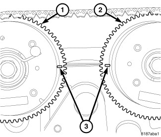 4. The marks on the camshaft sprockets (3) should be in line with the cylinder head cover sealing surface.