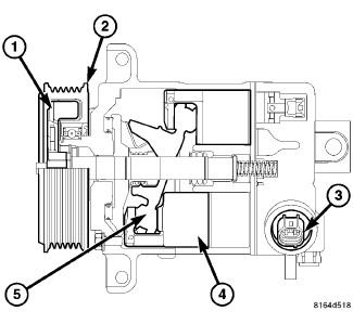 The Denso 6SEU16 A/C compressor used on all gasoline engine equipped models, is a variable displacement compressor (VDC) that is driven by the engine through a drive hub (1) and pulley (2). This A/C compressor does not require the use of an electromagnetic clutch, as the compressor uses an integral control solenoid (3) to reduce or increase the stroke of the five pistons (4) within the compressor by automatically adjusting the angle of the swashplate (5).
