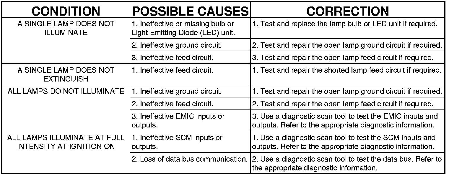 However, conventional diagnostic methods will not prove conclusive in the diagnosis of the interior lighting system or the electronic controls or communication between modules and other devices that provide some features of the interior lighting system. The most reliable, efficient, and accurate means to diagnose the interior lighting system or the electronic controls and communication related to interior lighting system operation requires the use of a diagnostic scan tool. Refer to the appropriate diagnostic information.