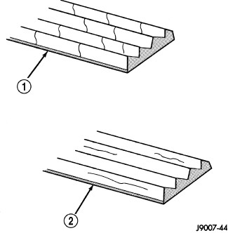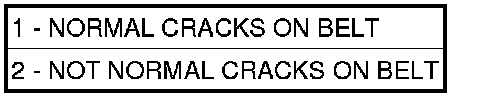 When diagnosing serpentine accessory drive belts, small cracks that run across the ribbed surface of the belt from rib to rib (1), are considered normal. These are not a reason to replace the belt. However, cracks running along a rib (not across) (2) are not normal. Any belt with cracks running along a rib must be replaced. Also replace the belt if it has excessive wear, frayed cords or severe glazing.