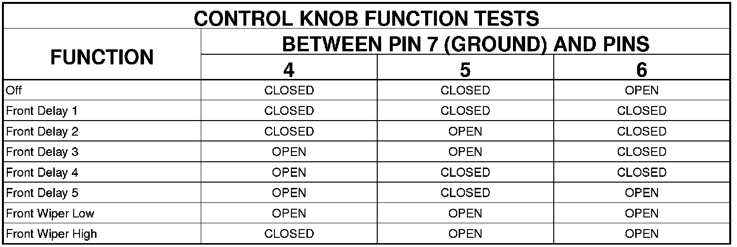 2. Using an ohmmeter, test the resistance between the terminals of the switch as shown in the three Function Tests tables. For all functions except those of the control stalk the values should be either less than 100 ohms (switch CLOSED) or greater than 1 megohm (switch OPEN).