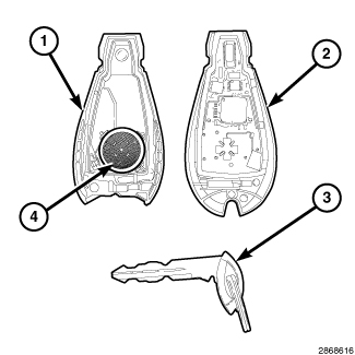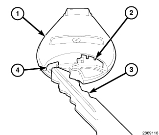 1. Unlatch and remove the emergency key from the storage slot (2) of the FOB with Integrated Key (FOBIK) case (1).
