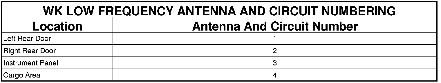 The number of antennas and the specific antenna locations are designed to ensure complete vehicle interior coverage. The LF antennas are each numbered and connected to the PEM on dedicated and sequentially numbered circuits. This arrangement allows the PEM to localize the positions of transmitting FOBIK units using a triangulation strategy. See the WK Low Frequency Antenna And Circuit Numbering table.