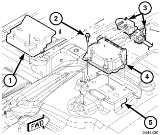 2. Install and tighten the three screws (2) that secure the ORC to the ORC bracket that is welded onto the floor panel transmission tunnel. Tighten the screws to 10.5 Nm (95 in. lbs.).
