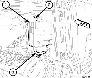 1. Position the Heated Seat Module (HSM) (1) to the instrument panel and connect the wire harness connector (3).