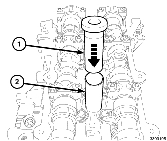 5. Install the top half of Spark Plug Tube Installer (1) into the spark plug tube to be removed (2).