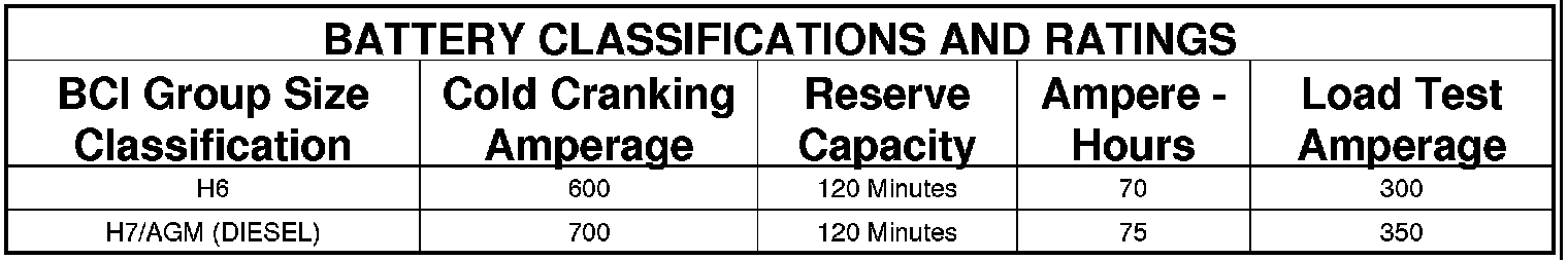 NOTE: Vehicles equipped with a diesel engine utilize a unique battery. The specifications for this battery may differ from the standards shown here. Refer to the battery manufacturer for detailed specifications.