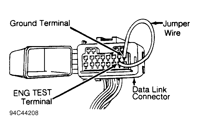 - Ensure engine is at normal operating temperature. Turn off all accessories. Connect a jumper wire between terminals GROUND and ENG TEST (Light Green/Yellow wire) of Data Link Connector (DLC). DLC is located in center rear of engine compartment, in front of bulkhead. See Fig 1 .