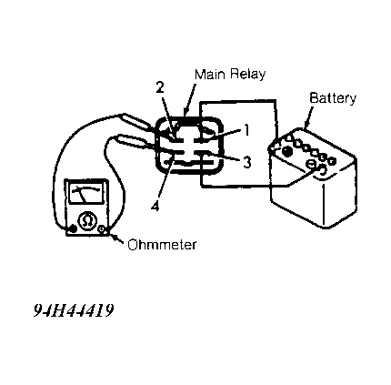 - Apply 12 volts to terminal No. 1, and ground terminal No. 3. See Fig 1 . Using ohmmeter, check continuity between terminals No. 2 and 4. Continuity should exist with 12 volts applied. Continuity should not exist with no voltage applied. Replace main relay as necessary.