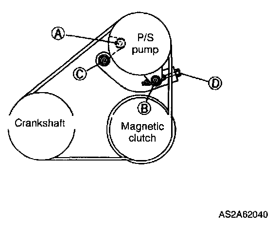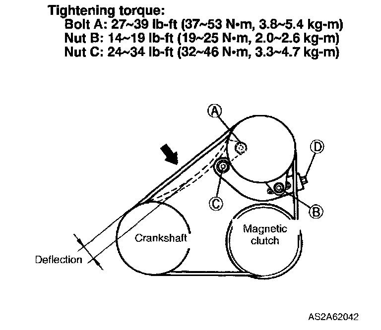 2. Turn adjusting bolt D and adjust deflection of drive belt to within specification.