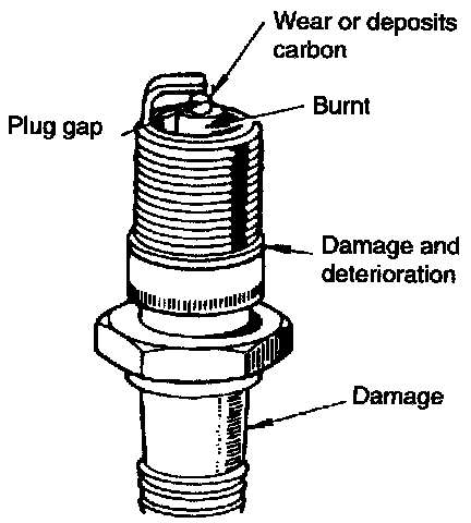 - Broken or burned ceramic insulator. If present replace plug.