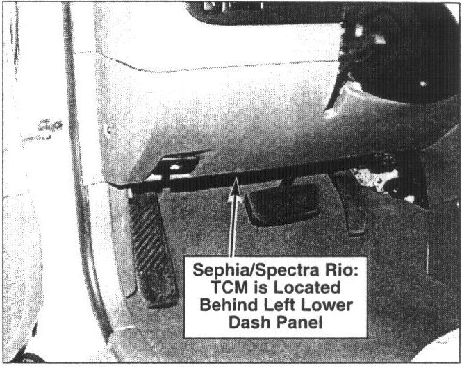 6. Locate TCM under left lower dash area. (Sephia/Spectra shown; Rio similar).