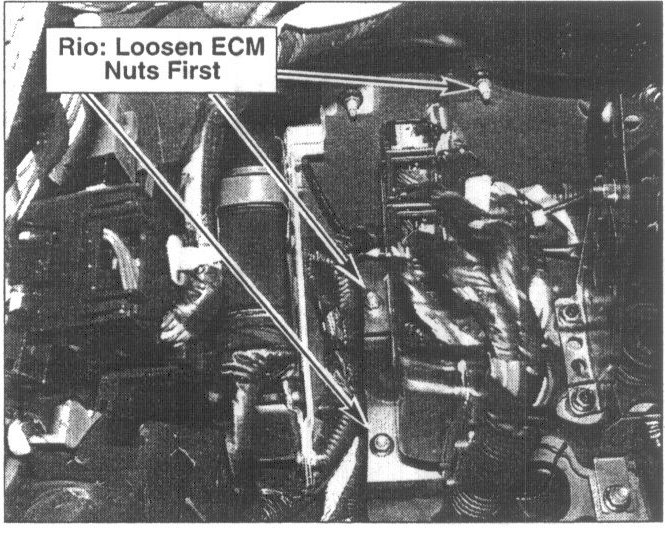 7. Rio only: loosen and remove (3) mounting nuts that secure ECM mounting bracket to firewall (these are also used to secure TCM).