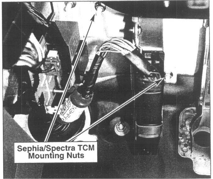 9. Sephia/Spectra: Loosen and remove nuts (2) that secure TCM mounting bracket to firewall.