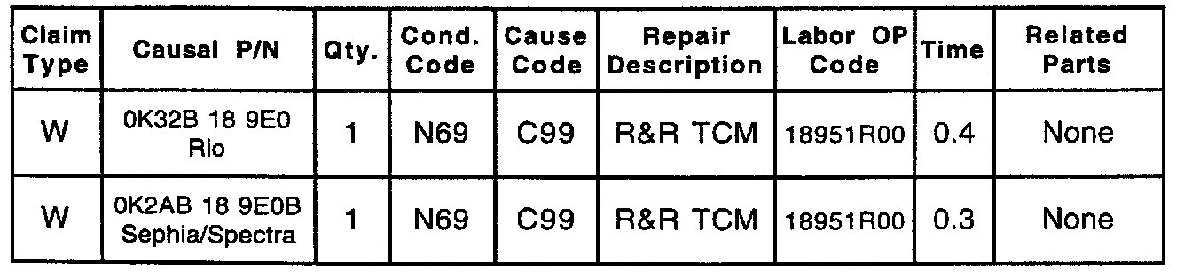 This bulletin provides information related to a logic change in the Transmission Control Module (TCM) for 2001 MY Rio and 1998 through 2001 MY Sephia and Spectra vehicles built after 10/18/00.