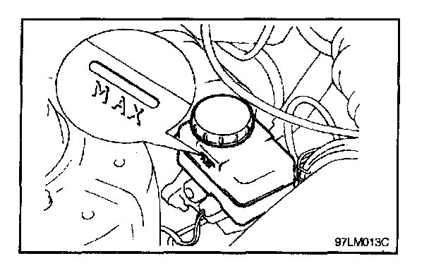 3. If the level is lower than the "MIN" marks, add fresh brake fluid up to the "MAX" mark.