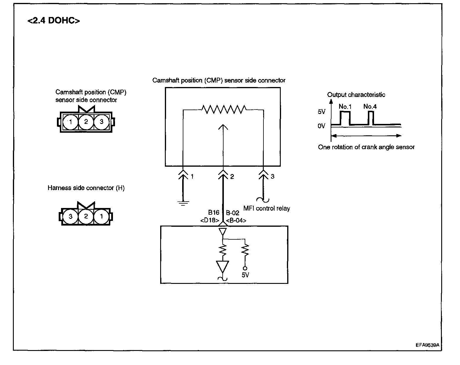 CAMSHAFT POSITION SENSORThe CMP sensor senses the camshaft position sensor on compression stroke of the No.1 and No.4 cylinders, converts it into a pulse signal, and inputs it to the ECM. The ECM then computes the fuel injection sequence, etc. based on the input signal.
