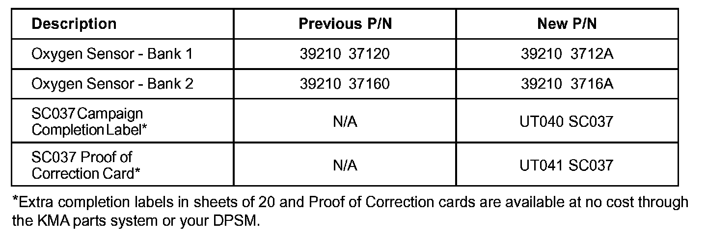 1. 2001 MY Optimas: Install improved 02 Sensors, if they were not installed in Campaign SC028, Optima Oxygen Sensors, published March 2003. Follow the Replacement Procedure for 2001 MY 02 Sensors in this campaign and then reprogram ECM following the Reprogramming Procedure for 2001 MY and 2002MY ECM in this campaign.