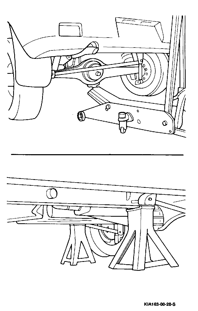 When vehicle is jacked from the center of rear crossmember, safety stands should be placed at the forward spring hanger of the rear spring on both sides of the body frame.