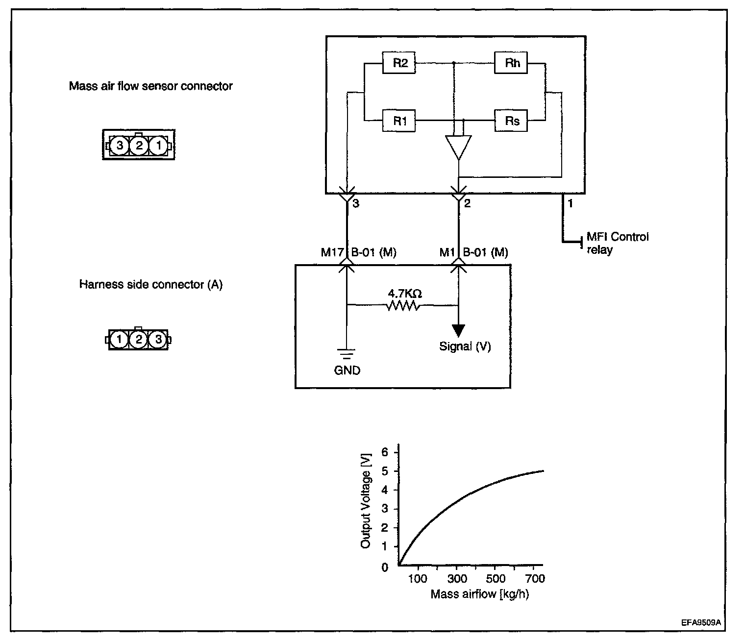 Mass air flow rate is measured by detection of heat transfer from a hot film probe because the change of the mass air flow rate causes change in the amount of heat being transferred from the hot film probe surface to the air flow. The air flow sensor generates a pulse so it repeatedly opens and closes between the 5 V voltage supplied from the engine control module. This results in the change of the temperature of the hot film probe and in the change of resistance.
