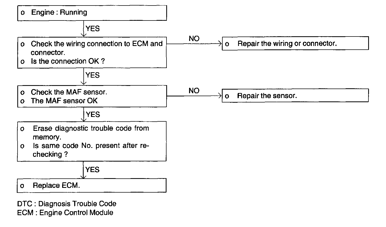2. If the MAF sensor output voltage is other than 0 when the ignition switch is turned on (do not start the engine). Check for the faulty MAF sensor or ECM.