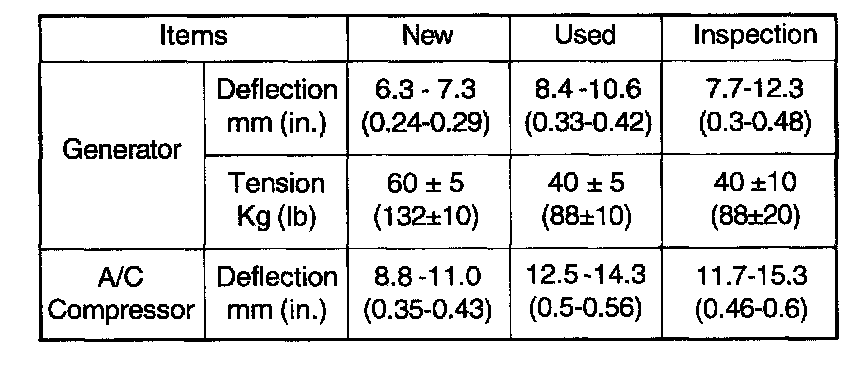 CHECKING BELT TENSIONApply 100 N (22 lbs.) force to the backside of the belt between the pulleys as shown in the illustration, measure the amount of deflection Measure tension with a tension gauge.