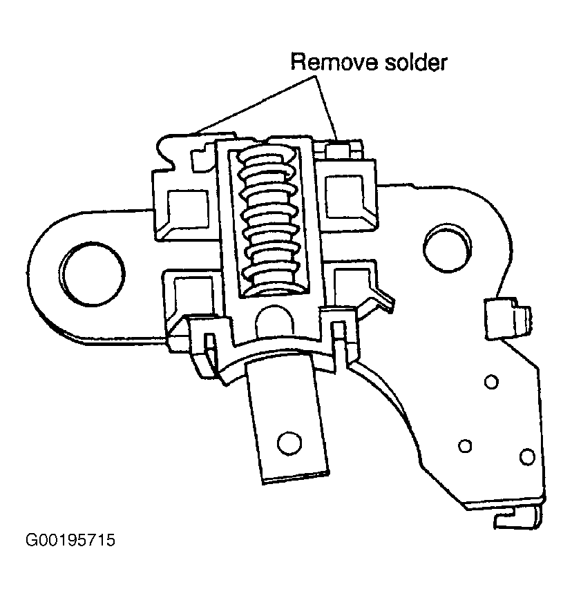 - Using soldering iron, remove solder from rectifier and stator leads. Remove regulator. Remove solder from pigtail and remove brush. See Fig 1