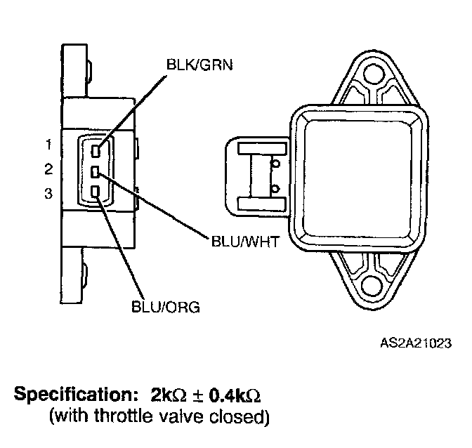 3. Connect voltmeter between terminals 1 (BLK/GRN wire) and 3 (BLU/ORG wire) on throttle position sensor connector.
