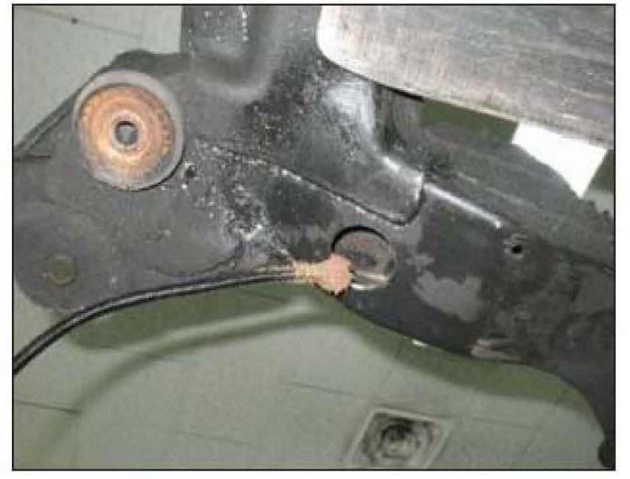 a) Strike the underside of the subframe lightly with a hammer to cause vibration and dislodge any rust scale.