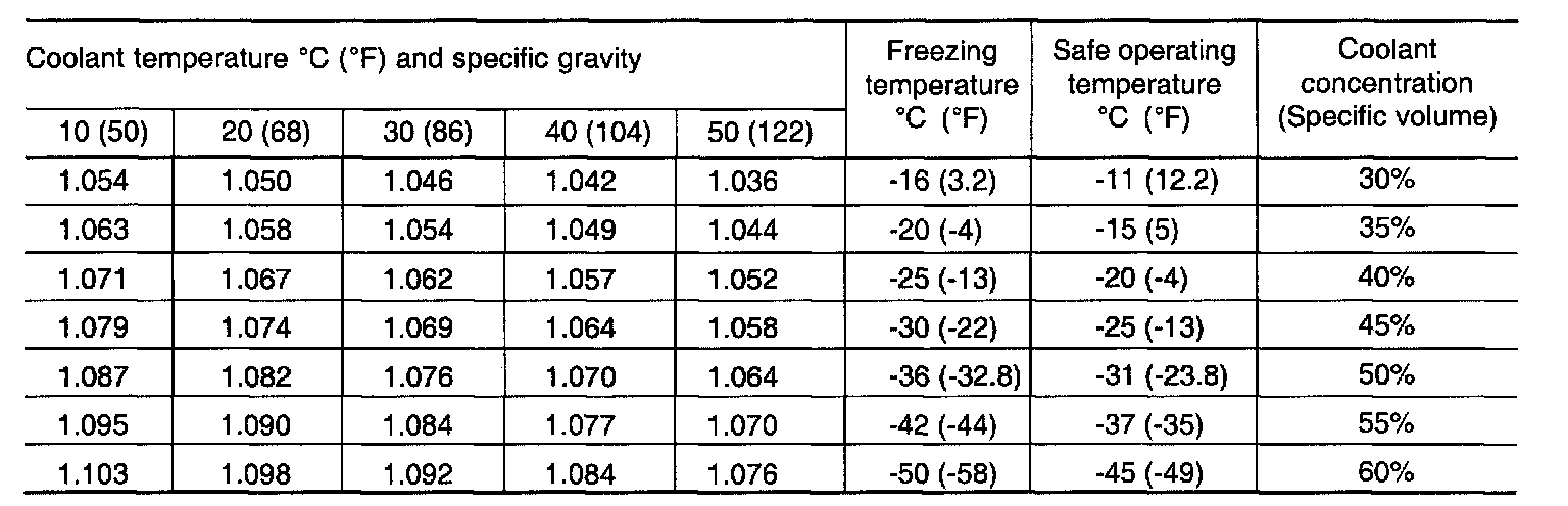 2. Measure the coolant temperature, and calculate the concentration from the relation between the specific gravity and temperature, using the following table for reference.