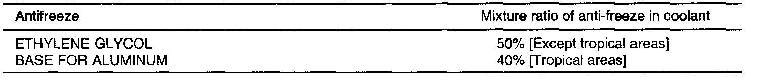 CAUTION: If the concentration of the coolant is below 30%, the anti-corrosion property will be adversely affected. In addition, if the concentration is above 60%, both the anti-freeze and engine cooling properties will decrease, affecting the engine adversely. For these reasons, be sure to maintain the concentration level within the specified range. Do not use together with another brand's product.