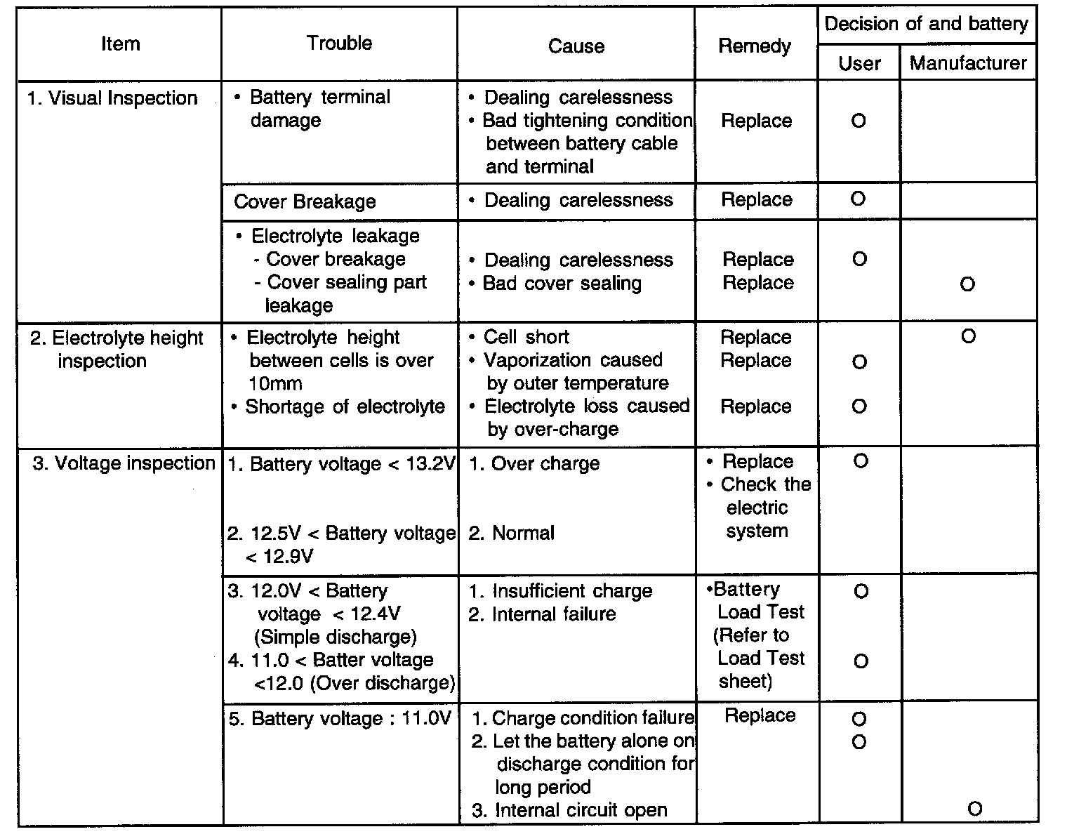 3. If the battery voltage (left alone within 2 hours after recharging) is over 12.5 V and the voltage after load test is over the standard value, this battery can be used.