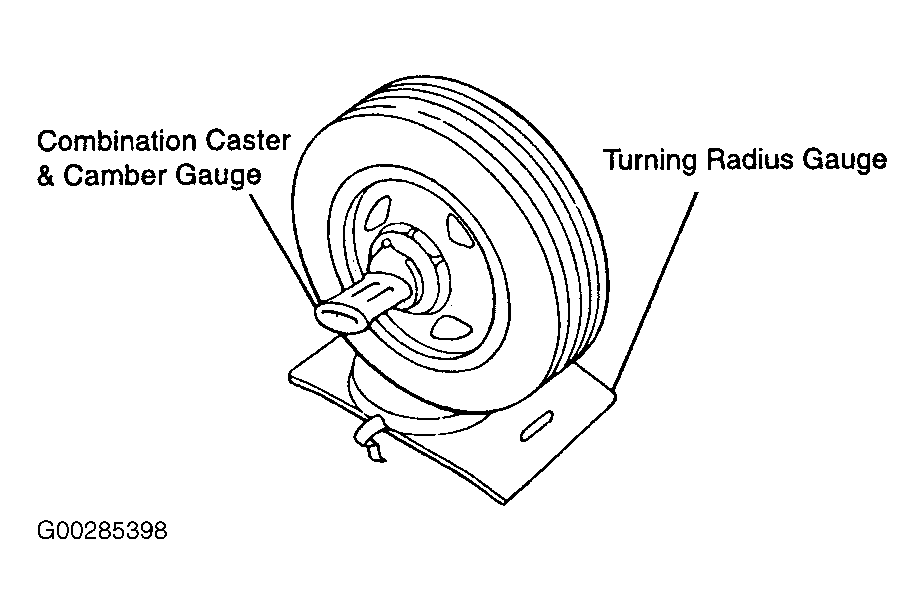 - Position the vehicle so that the front wheel is on the turning-radius gauge. Remove wheel cover. Attach the standard caster gauge to the hub and measure the caster. See Figure .