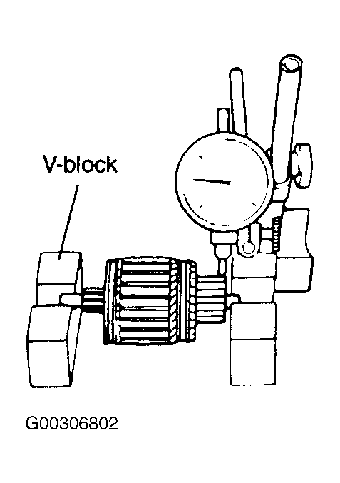 - Place armature on "V" blocks. Using a dial indicator, measure runout at commutator. If runout is not within specification, repair armature with a lathe or replace armature. See Fig 3
