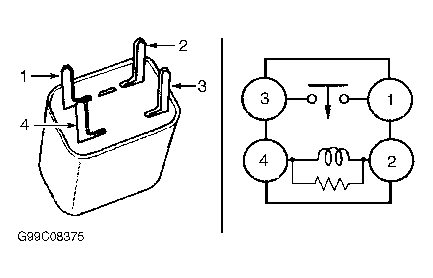 - Check continuity between relay terminals No. 1 and 3. Continuity should exist. If continuity does not exist, replace relay.