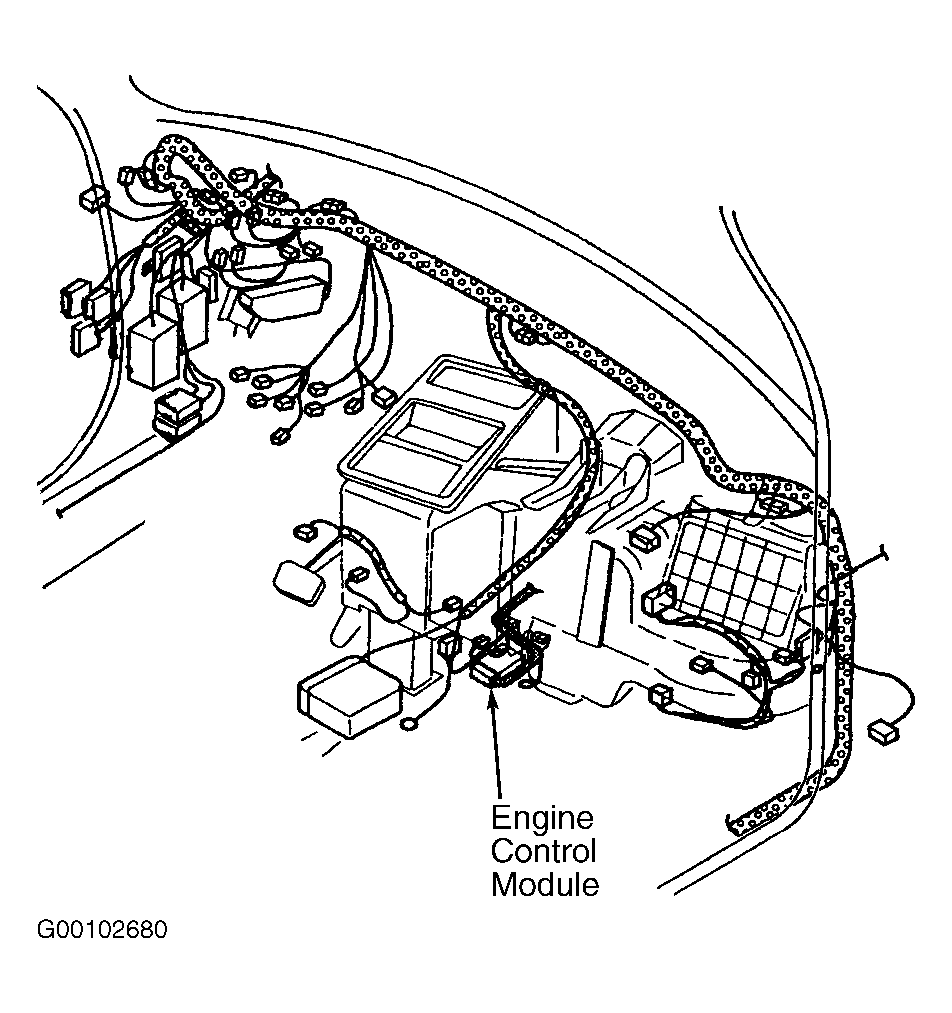 Engine Control Module (ECM) is located below center of instrument panel, under carpet on passenger's side. See Fig 1 and Fig 2 .